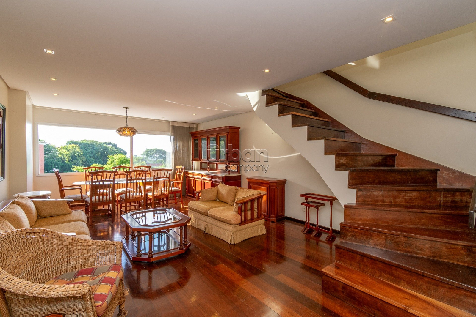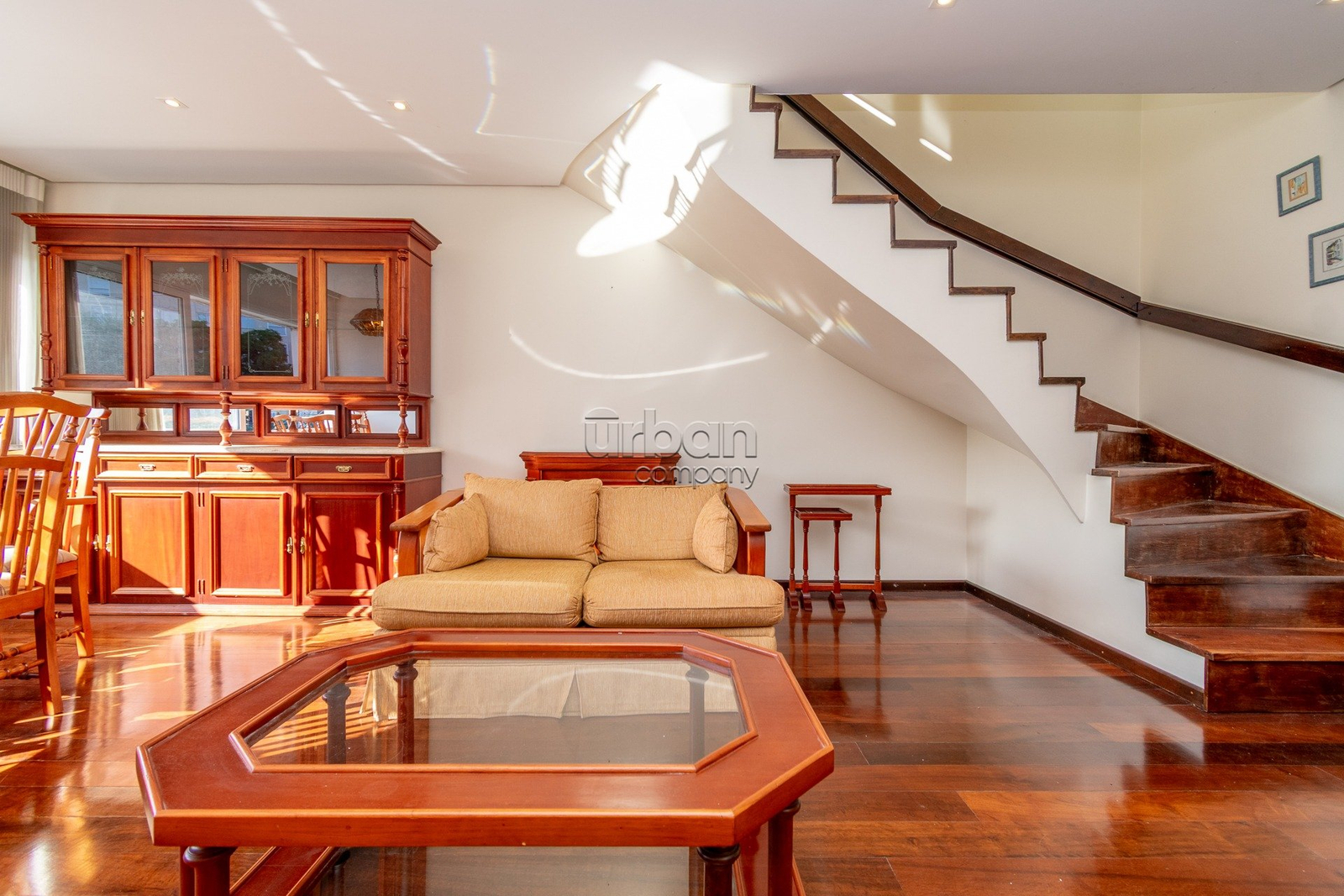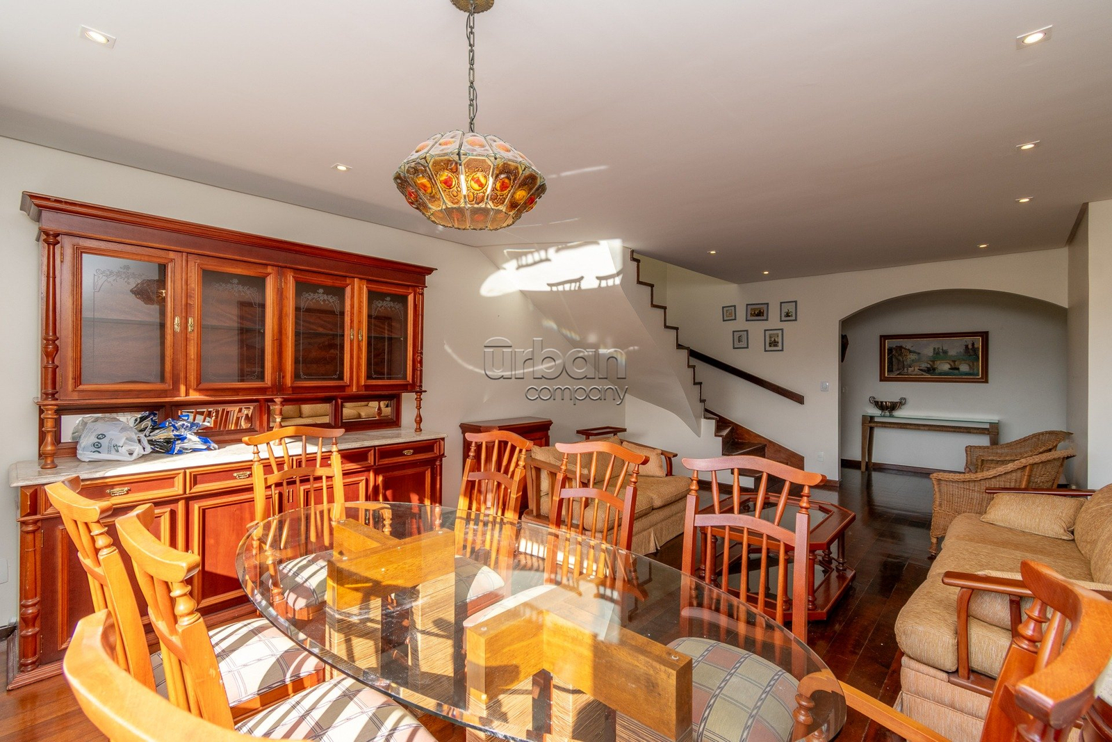 No pavimento inferior, o imóvel conta com 3 dormitórios, sendo 1 suíte, além de banheiro social, living para estar e jantar, cozinha sob medida, dependência completa e área de serviço independente.