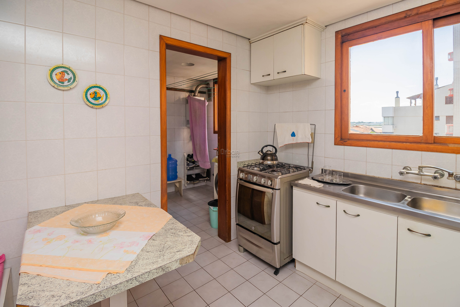 O living amplo é perfeito para até 3 ambientes, ideal para momentos de convivência. A sacada fechada em L com churrasqueira é um espaço aconchegante para receber amigos e familiares. A cozinha é funcional e possui uma área de serviço independente com banheiro auxiliar.