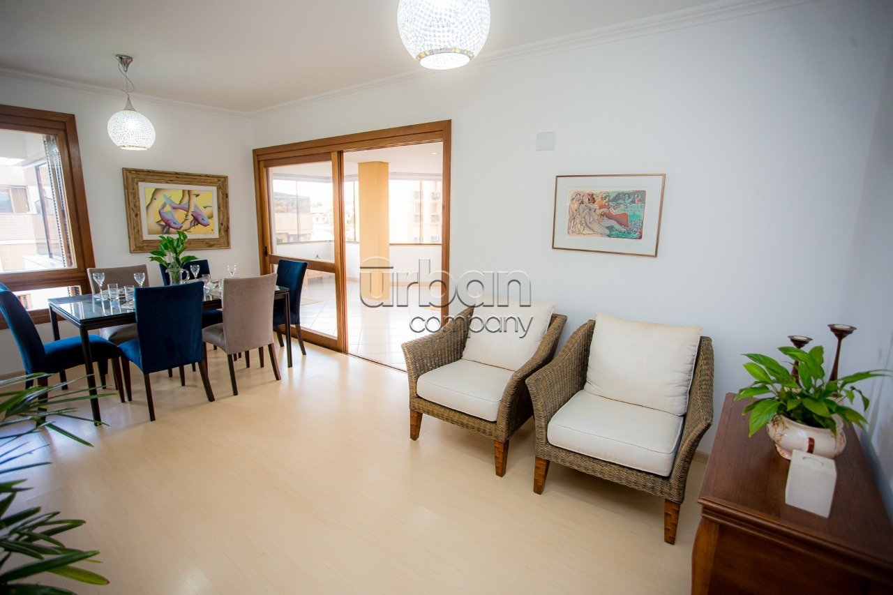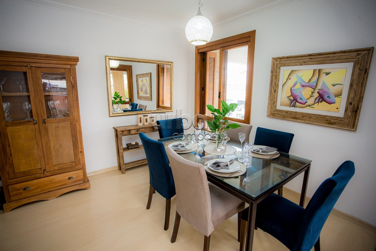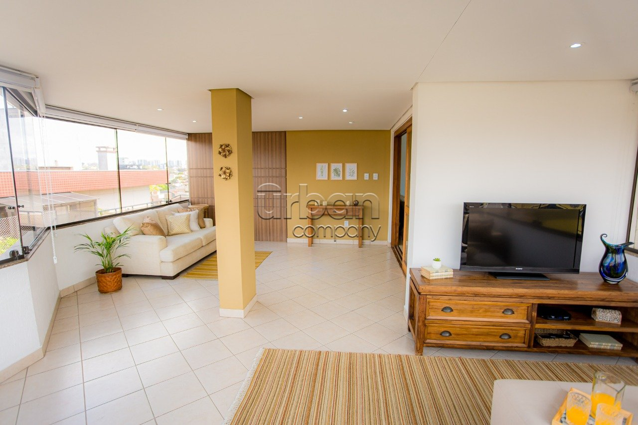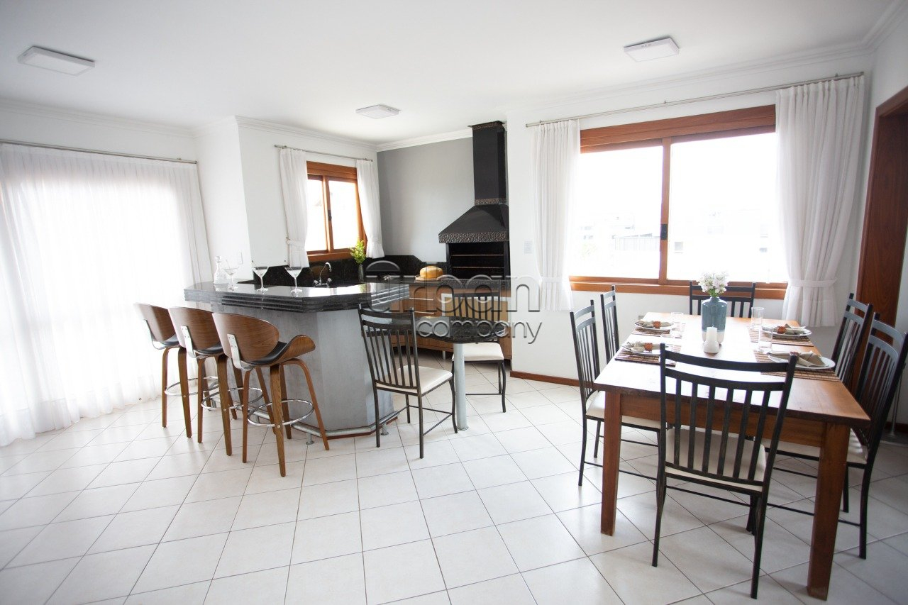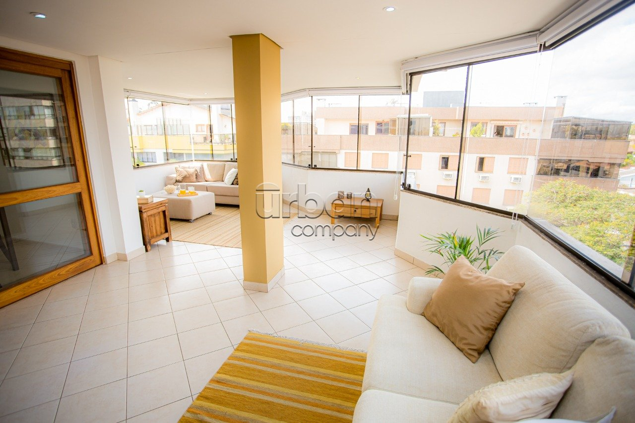 Cobertura toda reformada, possui 261m² privativos, 3 dormitórios sendo 1 suíte com hidro e sacada, living 5 ambientes, bar com balcão em mármore Travertino, escadas com degraus em granito. No segundo pavimento, salão de festas, sala de TV, banheiro completo e um ótimo espaço churrasco, duas áreas descobertas, sendo a maior de frente e a outra de fundos com deck e piscina.